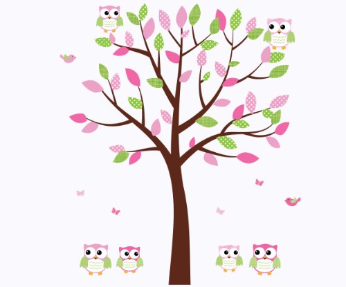 Childrens壁デカール、ホワイトツリー壁デカール、フクロウ壁デカール、フクロウステッカー Full Decal: Small Vinyl Tree ピンク 6FATOWLS_SmallTree_Vinyl_pinkgreen