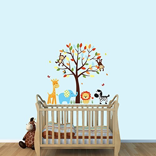 Animals and Leaves are a FABRIC repositionable/reusable decal material;Tree is printed on a FABRIC Repositionable/Reusable Material;Will work on Smooth or Slightly Textured Walls and is easily Removable.;Everything is individually cut and applied.;Decal Includes: 1 tree with leaves (approx. 29 wide x 37 high), 2 Monkey (approx. 6 x 8 and 5.4 x 9.2), 1 elephant (approx. 14.8 x 9.7), 1 Giraffe (approx. 8.4 x 18.3), 1 Lion (approx. 9.2 x 8.6), 1 Zebra (approx. 10.5 x 10.7), 1 Bird (approx. 2 x 2.4), 6 Butterflies, 4 Grass, and 2 Optional Bows.