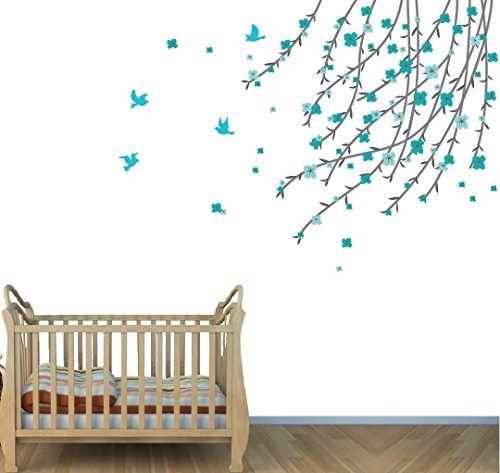 - Branch Tree Decals, Flowers in Tree Stickers, Teal Gray Girls Room