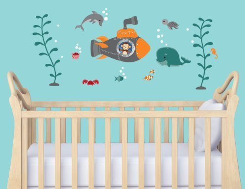 Decal Includes:?1 Dolphin (Approx. 8.6" x 6.4") ,1 Submarine with Monkey inside (Approx. 18.3" x 14.1"), 1 Blowfish (Approx. 3" x 2.2"), 1 Crab (Approx. 5" x 1.8"), 3 Fish (Approx. 2.7" x 2" to 1.8" x 1.2"), 1 Whale (Approx. 10.7" x 7.2"), 1 Seahorse (Approx. 2.3" x 3.3"), 1 Sea turtle (Approx. 5.5" x 3.4"), Seaweed (Approx. 9.3" x 22"), Will work on Smooth or Slightly Textured Walls, Everything is individually cut and easy to remove from the wall without damaging, Fabric Repositionable/Reusable Decal for EVERYTHING, Fabric decals will not stretch and are difficult to rip
