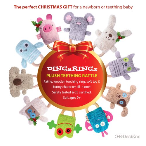 Wooden teether made of Eco timber Rubberwood;Soft plush toy;Rattle inside for stimulation;DINGaRINGs improve baby's hand dexterity and hand eye coordination