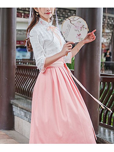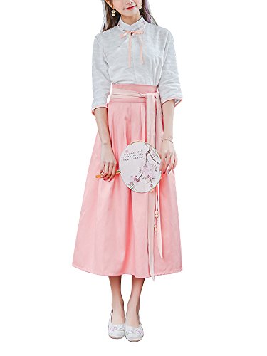 OCHENTA レディース ガールズ 春夏秋 中国伝統風 漢服 学生向け カジュアル 可愛い 綿 2セットトップス+スカート ワンピース ピンク L
