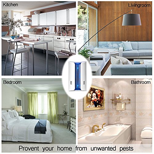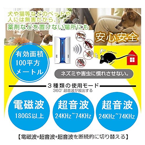 - 【効果抜群】本製品は電磁波+2種類超音波を断続的に切り替えることにて360°害虫や動物を駆除する装置です、隅々まで有効的に室内の害虫を駆除することができます。また、発生した超音波は害虫類に不快感を与えると共に、食欲、攻撃力及び繁殖力を失わせることで、私たちの家から徹底的に撃退することができます。
