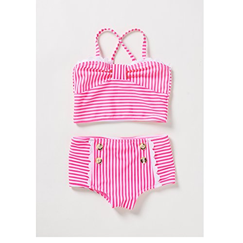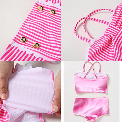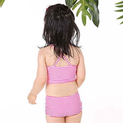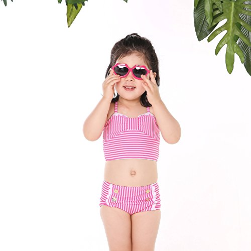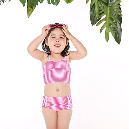 ONEBABY キッズ 水着 ワンピース ハイウエスト ショートパンツ 2点セットuvカット 紫外線対策 女の子 スイムウェア ボーダー柄 (130#, ピンク)