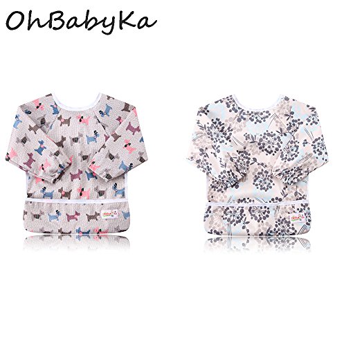 OHBABYKAベビー エプロン 長袖 防水 お食事 お食事練習 お絵描き 粘土遊び などに最適 子供 幼児 スモック 食事用 キャッチポケット付き 2枚セット 6ヶ月 ~ 24ヶ月 (ZY0608JP)