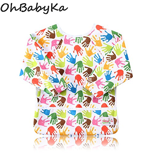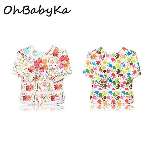 OHBABYKAベビー エプロン 長袖 防水 お食事 お食事練習 お絵描き 粘土遊び などに最適 子供 幼児 スモック 食事用 キャッチポケット付き 2枚セット 6ヶ月 ~ 24ヶ月 (ZY1314JP)