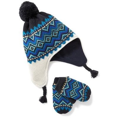 オールドネイビー OLD NAVY/ ポンポントラッパービーニー&ミトンセット ブルーフェアアイル 小物 L(4歳~5歳)【並行輸入】