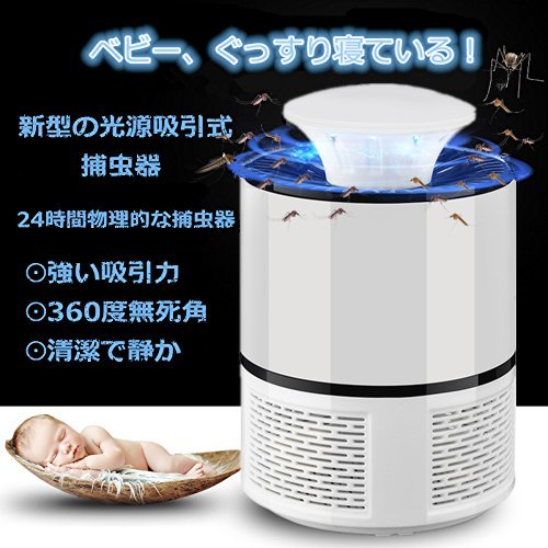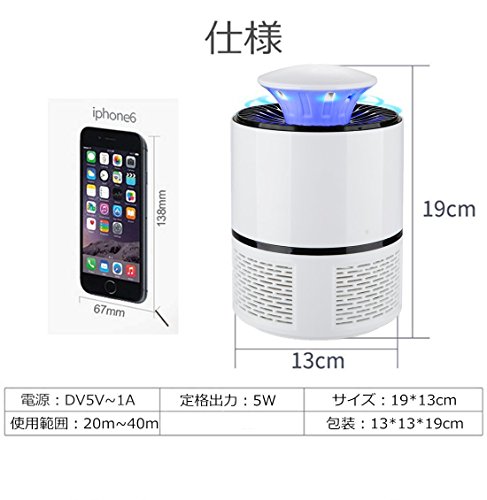 特徴 ●蚊の特性である二酸化炭素や体温に反応し、ターゲットを探し出すことを利用! 蚊取り器に使用されているUVライトが誘虫効果のあるブルーカラーの近紫外線を発生する微熱と、光触媒によって発生する二酸化炭素で蚊をおびき出します。 ●おびき寄せられた蚊は、吸引ファンで発生した気流に乗せられて、底部のカゴに追い込み逃げ出せずに風化死滅されます。吸引ファンは音も小さく、静かで安眠できます。 ●物理的な方法で、毒素、煙、臭いや放射線などは全然ありません。便利で清潔な殺虫器です。薬なしで細かいネットだから、赤ちゃんやおペットでも安全・安心してご使用いただけます。 ●かごは簡単に取り外しできるのでお手入れも簡単で何度でも使えてとても便利な蚊取り器です。 ●低電圧の作動で、安全で省エネです。 対応環境 屋内:寝室、洗濯室、台所・居間・玄関先・応接間・ベランダ(軒下)などに最適です。 アウトドア:キャンプ、テント、庭など 使用方法 -電源オン 1.電源プラグをコンセントに確実に差し込んでください。(USBコードはモバイルバッテリー、パワーバンク、ラップトップ、コンピュータなどの電源元があります) 2.電源スイッチをONにしてください。ライトが点灯し、ファンが回り、起動します。 3. 停止するときはスイッチをOFFにしてください。ライトが消灯し、ファンが止まり停止します。 虫の掃除・お手入れの仕方 (1)蚊の風化した残骸を取り除くときは、本体を反時計方向に少し回せば、本体上部とカゴ部は外れます。カゴ内の残骸を取り除き、布などできれいにお手入れしてください。 (2)セットするときは、本体とカゴ部の切れ込みを合わせて時計回りに少し回すとセットできます。 注意事項 1. よりよい効果を活かすために、蛍光灯、テレビ、外光など他の光源の介入を防ぐには、本製品を使用する時、他のランプ電源を切ってください。 2. 電動ファンやエアコンなどは製品に真っ直ぐに風を吹かないでください! 3. より良い効果が効くために、閉鎖された環境でそれを使用することをお勧めです。 4. 目を保護する種に、デバイスが動作している場合に、長い時間LEDの光を凝視しないでください。 5. 本製品が子供の手の届かない場所に配置する必要があり、事故を避けるために、それに指または他の金属物を入れないでください。 6. 長期間使用しない場合製品のプラグを抜いて、安全な場所に置いてください。 7. ライト部分、モーター部分は水などで洗わないでください。故障の原因となります。 8. 長期間使用されない場合は、電源プラグをコンセントから抜いてください。 9. 本製品のデザイン、仕様等は予告なく変更する場合があります。あらかじめご了承ください。