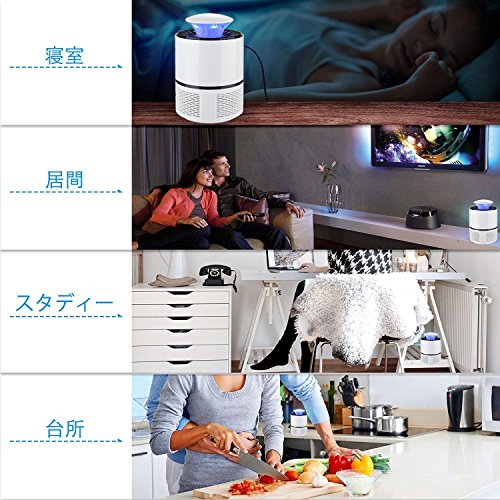 - 【強い吸引力】蚊の特性である二酸化炭素や体温に反応し、ターゲットを探し出すことを利用! 蚊取り器に使用されているUVライトが誘虫効果のあるブルーカラーの近紫外線を発生する微熱と、光触媒によって発生する二酸化炭素で蚊をおびき出します。