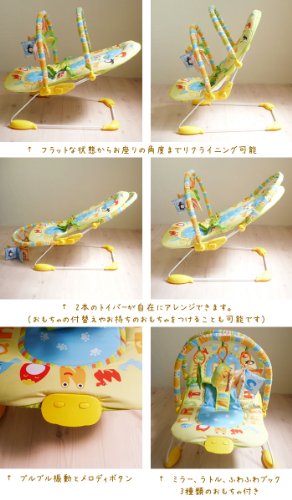 移動もラクラク!角度調節可能なバウンサー ●ぶるぶる振動が心地よい眠りを誘います。 ●優しいメロディでリラックス ●2本のバーを持って、移動楽らく。お出かけにも ●シートの角度調節OK ●幅広3点式ベルトがお子さまをしっかりホールド ●シートパッドは取り外して洗濯OK ●生産者賠償責任保険付で更に安心 ●3つの楽しいおもちゃ付き ●脚部はしっかりしたフレームで安心設計。 ●組み立ても簡単 ●カラーボックス入りでプレゼントにも最適 ■対象年齢:0歳から ■サイズ:51x80x60cm ■重量:約2.7kg ■備考:耐荷重量約11kg 単3乾電池×2本(別売)