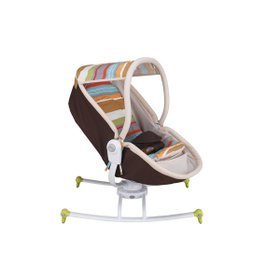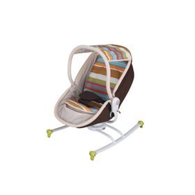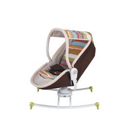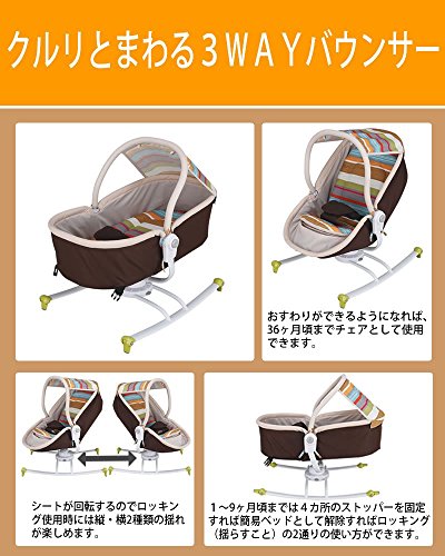1~9ヶ月頃まではロッキングフレームの4カ所のストッパーを固定すれば、簡易ベッド、4カ所のストッパーを解除すればロッキング(揺らすこと)の2通りの使い方ができます。おすわりができるようになれば、36ヶ月頃までチェアとして使用できます。シートが回転するのでロッキング使用時には縦・横2種類の揺れが楽しめます。
