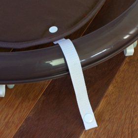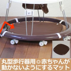 ベビーウォーカー(歩行器)にスナップで取り付けるだけ! 丸型歩行器のリング枠に装着するだけで、歩行器が動かないように赤ちゃんの歩行を止めることができます。食べ物をこぼしのおそうじもラクラク! 約幅64.5x奥行64.5cmの丸形歩行器であれば、どれでも取り付け可能 ※歩行器は付いておりません。