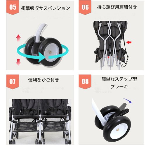 - 5キロ以内の軽さを誇り、いつでも便利かつ自由に移動が可能!機内持ち込みも可能な国内超軽量級の双子用ベビーカーです。2段背もたれ調節により、赤ちゃんが快適にやすむことができます。