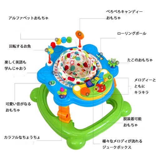 - 360度シート回転によりお子様の視野を広く様々なおもちゃを選んで遊べます。またシートは外して洗濯可能です。