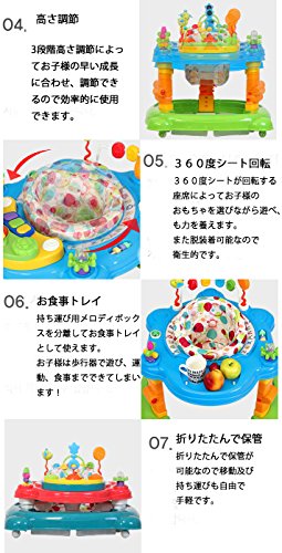 - 3段階の高さ調節が可能なので、お子様の成長に合わせて使用できます。ポータブルメロディボックスを外して、お子様のお食事トレイとしても可能です。