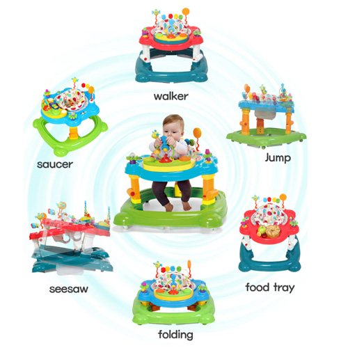 - 歩行器、ソーサー、シーソー、ジャンパルー、離乳食トレイ、折りたたみの6つの機能が一度に!