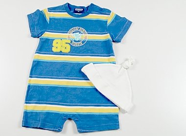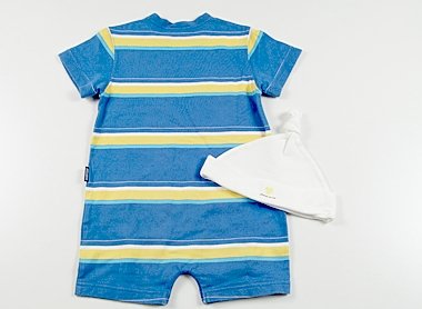 スポーティーなボーダーカバーオール。全体的に色褪せがありますが目立った汚れのない良品です。たくさん必要なベビーサイズ、洗い替え用にいかがでしょうか?おまけにCOMME CA ISMの帽子付き。