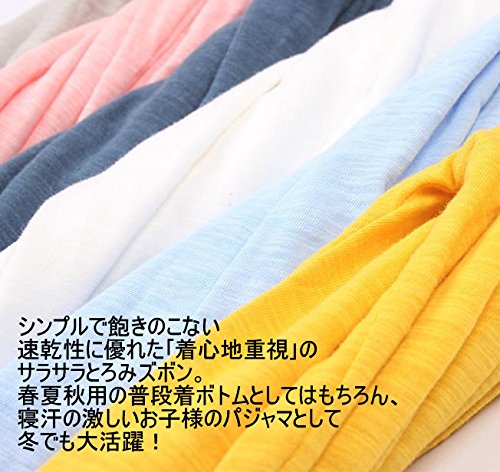 - シンプルで飽きのこない速乾性に優れた着心地重視のサラサラとろみズボン。春夏秋用の普段着ボトムとしてはもちろん、寝汗の激しいお子様のパジャマとして冬でも大活躍!お稽古のダンス衣装としても最適です!フロント・センター部分にはカモフラージュのストリング紐。お洗濯でホールから紐が外れてくる心配もなく、ズボンのウエスト自体は伸縮性ゴムでしっかりホールドできているので、いちいち紐を縛って調整する必要はありません。ちょうちょ結びでも自然に垂れ下げてても可愛いです。 裾はクロップドタイプのジョガー仕様。もたつきがなく、つまずきや激しい動きもGoodカバー!! ロールアップしてお好みの丈にも調整可能です。8分や7分、ハーフ・ショートまで、トップスやシーンに合わせて自在に調節してください。女の子にもマッチする全8色展開です。