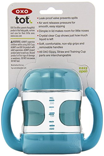 The OXO Tot Sippy Cup collection offers several spillproof solutions for teaching baby how to drink like a big kid. Available with and without handles, the 200 ml Sippy Cup is easy for little hands to hold when baby is transitioning from a bottle. The Sippy Cup with handles has soft, non-slip handles that are angled so baby doesn't have to turn his wrists too far; the handles are removable for when baby's grasp develops. All Sippy Cups have non-slip grips, a dimple in the lid that makes room for little noses, and transparent walls to show just how much is left. Each has a leakproof valve which releases pressure for comfortable sipping and is easily removable for cleaning. All OXO Tot Sippy, Straw and Training Cup lids are interchangeable. Suitable from 6 months. Complies with BS EN 14350 safety standard.