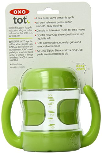 The OXO Tot Sippy Cup collection offers several spillproof solutions for teaching baby how to drink like a big kid. Available with and without handles, the 200 ml Sippy Cup is easy for little hands to hold when baby is transitioning from a bottle. The Sippy Cup with handles has soft, non-slip handles that are angled so baby doesn't have to turn his wrists too far; the handles are removable for when baby's grasp develops. All Sippy Cups have non-slip grips, a dimple in the lid that makes room for little noses, and transparent walls to show just how much is left. Each has a leakproof valve which releases pressure for comfortable sipping and is easily removable for cleaning. All OXO Tot Sippy, Straw and Training Cup lids are interchangeable. Suitable from 6 months. Complies with BS EN 14350 safety standard.