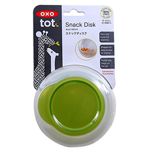 Enjoy snacks on the go with the bright green OXO Tot Snack Disk.Featuring a curved shape, low profile, and non-slip base, the 180 ml Snack Disk keeps snacks contained while your toddler learns to self-feed. Designed for children 12 months and older, the Snack Disk is moulded to fit comfortably in tiny hands or on small laps. A generous opening allows for easy access to the goodies inside, and a see-through lid snaps on securely for storing leftovers or taking treats on the go. Perfect for holding fruit, vegetables and dried snacks. Top-rack dishwasher safe for easy cleaning. Complies with BS EN 14372 safety standard.OXO Tot offers parents thoughtful products that help guide, nurture and care for their little ones. OXO making everyday living easier for over 20 years.