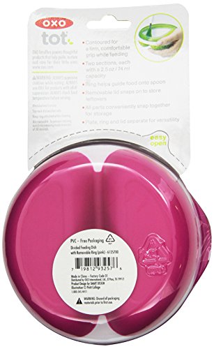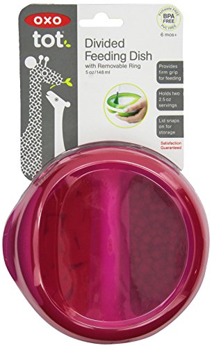 Spinach and carrots? Cereal and mashed bananas? Never mind juggling two bowls of baby food. The OXO Tot Divided Feeding Dish frees you to give your little one two foods in one contoured, comfortable-to-hold Dish, with its non-slip base and grip. Each section holds four ounces, the perfect size for stage-two jars of baby food. Easily guide pureed food onto spoons with the Dish's outer ring, then use its handy lip to remove excess food. Just pop on the lid and conveniently store leftovers. All parts snap together for storage and separate for easy cleaning.