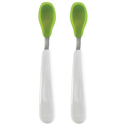 When it?s time for solids, try the OXO Tot Feeding Spoon. Available in sets of two, this Feeding Spoon has a protective food-grade silicone coating which is gentle on baby?s gums and mouth. The soft edges of the silicone can be used to scrape the last bit of sweet potato from the bowl or jar, or to gently wipe apple sauce from baby?s face. The shallow Spoon prevents feeding baby too much food at once. A contoured handle is comfortable to hold and angled for easy feeding.
