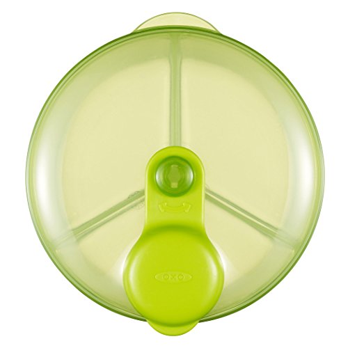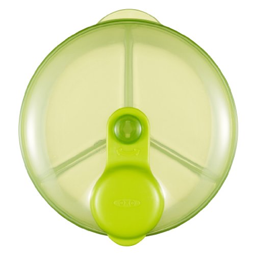 Holds enough powdered formula for three 9 ounce feedings Cap lifts open and swivels, staying out of the way for one handed pouring Lid rotates into place to align spout over desired compartment Soft, compact shape is easy to store in diaper bags Top rack dishwasher safe; BPA, phthalate and PVC free