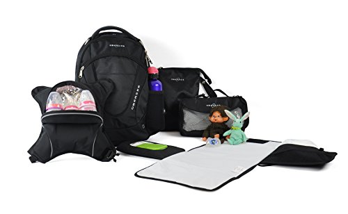 Features detachable insulated bottle cooler for up to three baby bottles or snacks;Includes: Obersee Voila changing mat kit, separate wet pouch and removable clothing cube;Adjustable breathable mesh padded straps and ergonomic, padded back for ultimate comfort;Roomy backpack features multiple pockets for supplies such as diapers, wet wipes, other baby items, and mom and dad's personal items;Features pockets for tablet computer and laptop computer (up to 15)