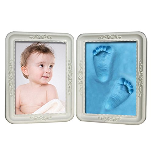 Ochine 7インチ 二つ折り ベビーフレーム記念品 赤ちゃんの手形 足形フレーム 安全な非毒性の粘土 良品質のプラスチックフレーム 男女通用 出産祝い 記念品に最適 (ブルー粘土)