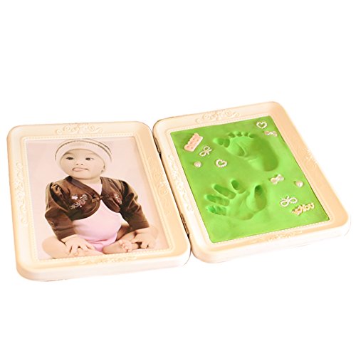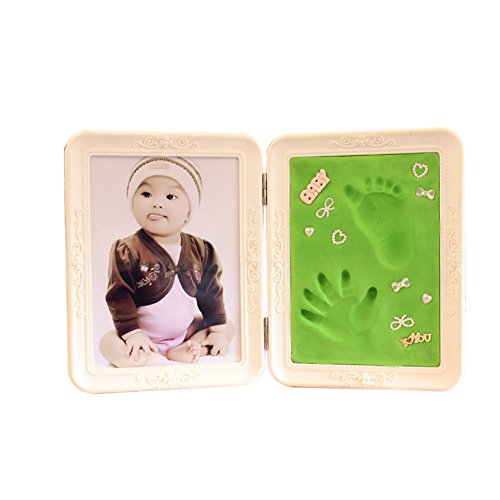 Ochine 7インチ 二つ折り ベビーフレーム記念品 赤ちゃんの手形 足形フレーム 安全な非毒性の粘土 良品質のプラスチックフレーム 男女通用 出産祝い 記念品に最適 (グリーン粘土)