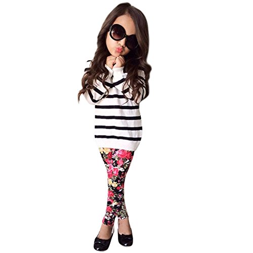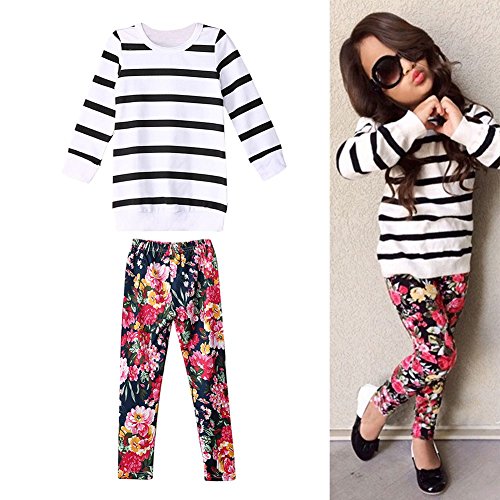 Ochine 女の子 ストライプTシャツ+フローラルパンツ セットアップ 子供服 ベビー パジャマ 普段着 子供 ベビー服 女の子 (2XL、5-6歳)