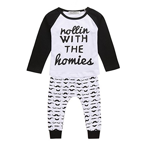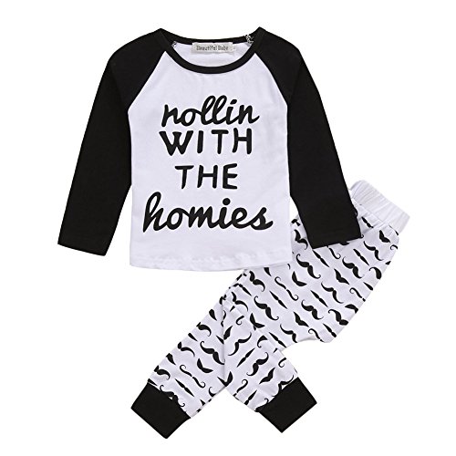 Ochine ファッション 英字プリント上着&ロングパンツ 黒白 上下 2点セット 男女兼用 かわいいプリント コットンブレンド 春秋 出産祝い 0-4歳設定 (90、1-2歳)