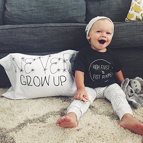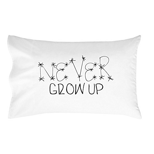14 X 20.5 TODDLER PILLOW CASE - Pillowcase decorated with never grow up in black that fits toddler and travel pillow inserts that are 18- 21 long and 13 - 15 tall.;SOFT AND BREATHABLE, NOT SCREEN PRINTED - Oh, Susannah? uses top quality, 120 Gram, Silky Soft brushed microfiber fabric in all our pillowcases. We use a?permanent fiber dyeing?process that leaves the decoration SOFT and BREATHABLE so you can sleep on the decoration and not even feel it. This is NOT a scratchy screen print on cheap paper thin cotton. ?You will love SLEEPING on these pillowcases just as much as looking at them.;CPSIA CERTIFIED DYE - We use only Consumer Product Safety Commission certified dye that meets strict standards for child skin contact safety.;EXTREMELY DURABLE, EASY CARE - Eco friendly dye process means mesign will never fade. Machine washable, quick drying, and wrinkle resistant. Just throw it in the wash as normal with any non bleach detergent.;BUY 3 SAVE 25% - We love our customers and want them to love us too. If you buy 3 or more Oh, Susannah? pillowcases (any design) you immediately save 25% at checkout (no coupon necessary). Options for weddings, birthdays, anniversary, graduation, kids room, dorm.