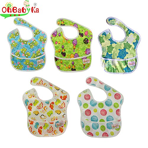 Ohbabyka5点セット ビブ お食事エプロン スタイ よだれかけ スーパービブ 防水 袖なし 保育園 ベビー用エプロン 給食 ポケット付き 赤ちゃん用エプロン 離乳食エプロン (SZY0305061114)