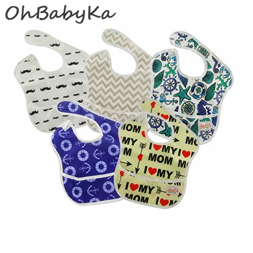 Ohbabyka5点セット ビブ お食事エプロン スタイ よだれかけ スーパービブ 防水 袖なし 保育園 ベビー用エプロン 給食 ポケット付き 赤ちゃん用エプロン 離乳食エプロン (SZY0204080910)