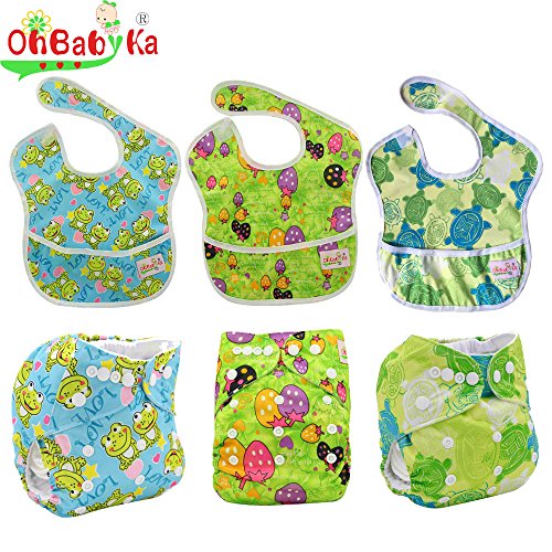 Ohbabyka6点セットフリーサイズ おむつカバー 布おむつ サイズ調整可 パンツ 食事用スタイ エプロン 防水ビブ ベビー 赤ちゃん 男の子 女の子 お食事エプロン 袖なし 保育園 給食 離乳食エプロン よだれかけ 出産祝い (SZY031114K0946OB131)