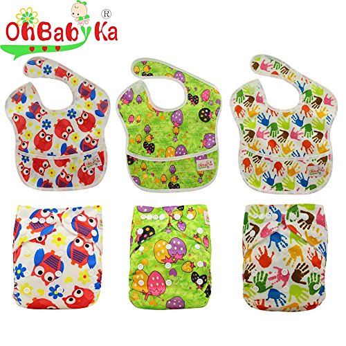 Ohbabyka6点セットフリーサイズ おむつカバー 布おむつ サイズ調整可 パンツ 食事用スタイ エプロン 防水ビブ ベビー 赤ちゃん 男の子 女の子 お食事エプロン 袖なし 保育園 給食 離乳食エプロン よだれかけ 出産祝い (SZY071113OB113127131)