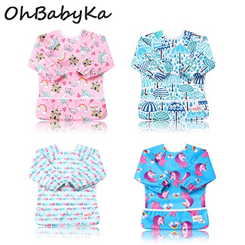 防水スモック 子供 エプロン 長袖 防水ビブ 防汚 絵画 食事用エプロン スタイ 遊び 料理作り用 ポケット付き ベビー 赤ちゃん 4枚セット 幼稚園 離乳食 保育園 入園準備 女の子 男の子 兼用 (ZY24282930)
