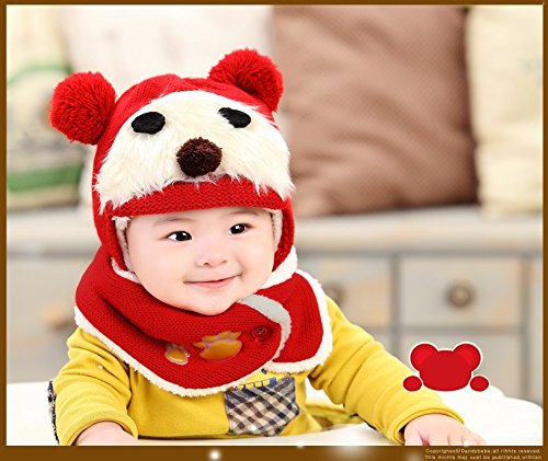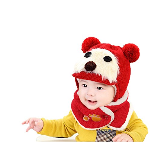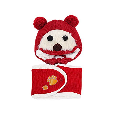 Ohpa子供用ニット帽+マフラー ニットキャップ キッズ・ベビー・子ども・男の子・女の子・男女兼用 秋冬 防寒 防風 かわいいマフラー セット耳まで 頭&首まであたたか (レッド)