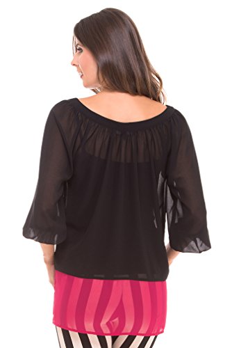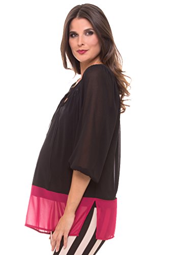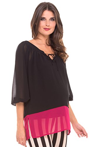 peasentスタイルのマタニティ薄手トップでブラックとホットピンクの詳細と3 / 4袖、カラーブロック、Vネックとネクタイ、ボタンサイズ(妊娠前のサイズ) XS / S = 0 – 6 M / L = 8 – 12 100 %ポリエステル