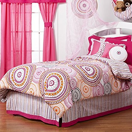 Comforter comes in our designer Sophia Circles on front and opposite side in Lolita Stripe both in cotton print fabric. Flat and fitted sheets come with our popping pink cotton fabric.