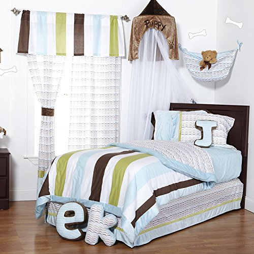 Puppy Pal Full Collection is so much fun. Comforter is reversible giving room a completely different look and feel . Front of comforter is in the collections blue, green and brown stripes. Back of comforter is in the collections signature fabric doggy dip. Both cotton print fabrics. Entire comforter is framed in the collections amazing blue minky. The softest around.