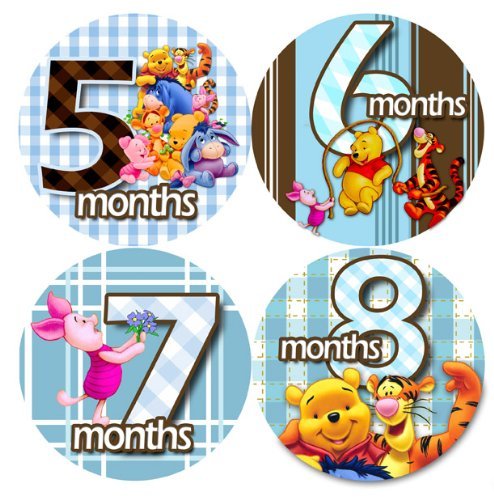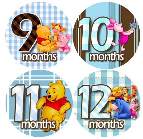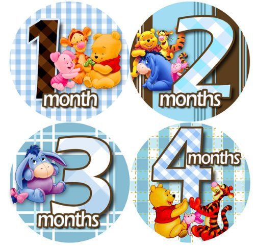 Winnie the Pooh onesie stickers. Great baby shower gift.;Adhesive sticker is super thin, waterproof.;Flexible and tear proof allowing it to bend with the babies movement.;Baby month stickers are used placed on the baby's shirt, as a photo prop for pictures.;Extra durable adhesive is completely removable.