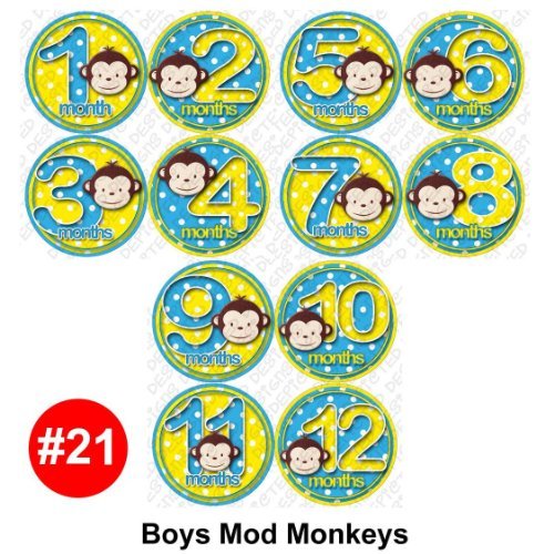 Boys Mod monkeys onesie stickers great baby shower gift!;Adhesive sticker is super thin, and waterproof.;Flexible and tear proof allowing it to bend with the babies movement.;Baby month stickers are used placed on the baby's shirt, as a photo prop for pictures.;Extra durable adhesive is completely removable.