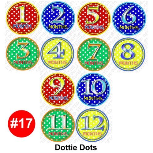 Dottie Dots Polka Dotted onesie stickers great baby shower gift!;Adhesive sticker is super thin, and waterproof.;Flexible and tear proof allowing it to bend with the babies movement.;Baby month stickers are used placed on the baby's shirt, as a photo prop for pictures.;Extra durable adhesive is completely removable.