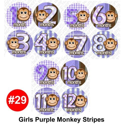 PURPLE MONKEY STRIPES Onesie stickers are great baby shower gift!;Adhesive sticker is super thin, and waterproof.;Flexible and tear proof allowing it to bend with the babies movement.;Baby month stickers are used placed on the baby's shirt, as a photo prop for pictures.;Extra durable adhesive is completely removable.
