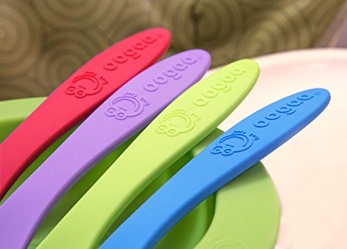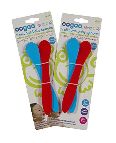 MAKE MEALTIME FUN AND ENJOYABLE: With the perfect balance of softness and hardness, the Baby Weaning Spoons feature an easy-grip design for parents and a charming, gender neutral animal aesthetic for babies. They also include a soft raised texture on the bottom which soothes tender gums and helps to stimulate baby's senses.;ODORLESS AND TASTELESS: We know infants can be difficult eaters. Our Baby Weaning Spoons are odorless, tasteless, and plastic free, meaning there won't be any bad metallic or chemical taste in your baby's food.;SAFE TO USE: Our soft silicone spoons are made from 100% high-grade European approved silicone (which adheres to higher than FDA standards) and are 100% BPA, PVC, lead, and phthalate free, making them completely safe to use for feeding time with your baby. They're also mold, fungus, and bacteria resistant.;EASY TO CLEAN: We know how messy toddlers can be. That's why the oogaa Baby Weaning Spoons are dishwasher, freezer, and electric sterilizer safe, and can be cleaned with hot soapy water for simple stain removal. Please note: Store in a dry place. Do not store in direct sunlight. Remove oil residue with fresh lemon or limes.;SPECIFICATIONS: Package includes 4 oogaa Baby Mealtime Weaning Spoons in Blue and Red. 8.5 inches long.