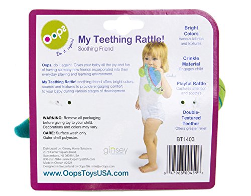 Bright colors, sounds and textures to engage and provide comfort to your baby during various stages of development;Double-textured teether, rattle and crinkle material incorporated into each Oops character;Wipe clean with damp cloth