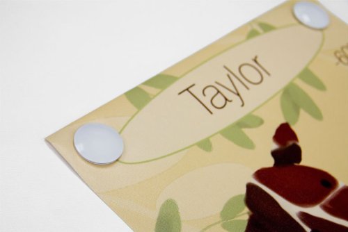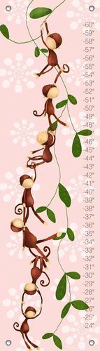 Growth chart featuring fun loving monkeys on a vine. Our kid's growth charts are created on the same artists canvas as our stretched wall art. Grommets placed in the four corners make them easy to hang. We provide color coordinated decorative covers that easily fit over the screw or nail you choose. This product creates a great childhood keepsake, and rolls up easily for safe storage. The growth chart can be wiped clean with a soft, dry or slightly damp cloth and should it wrinkle, the backside may be ironed on a low setting with light steam. A permanent marker (not included) is a great way to mark dates or ages on the chart.